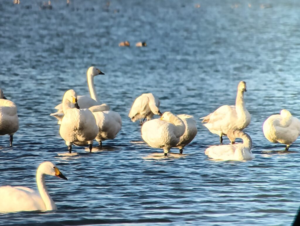 最後に、コハクチョウの群れを楽しみました。毎年、田んぼで採餌し群れている風景を観察するのですが、珍しく湖上での観察となりました。琵琶湖の水位が低いため本来なら水位があり入れない所から観察する事ができました。コハクチョウの群れの中に、ヘラサギがいる事も現地で情報を得ることができました。コハクチョウの群れの中をくまなく探すと1本立ちで頭を背に突っ込み休息している個体が1羽いました。その後、羽繕いした所でヘラサギと確認ができました。ヘラサギも体全体が白いため、見つけづらく、コハクチョウになりすましをしているようにも感じました。