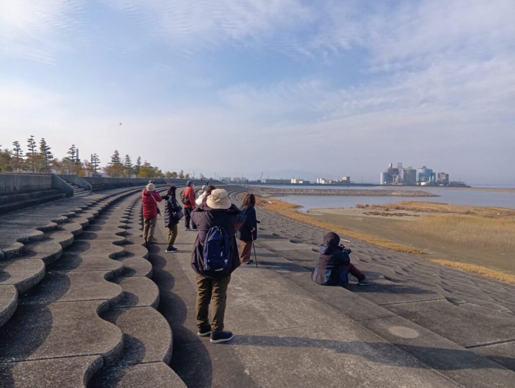 春を感じさせる穏やかな天気で安濃川河口バードウオッチングを開催しました。10時半過ぎに、バスは河近くの駐車場に到着。私自身、一番、緊張するタイミングでした。堤防にあがり、ミヤコドリの姿はどうかというのは、自然のためドキドキです。何とか、多少の群れが確認できた時はホッとしました。