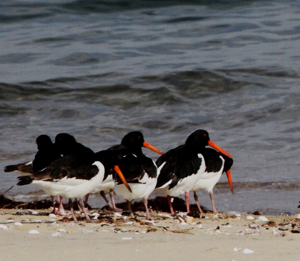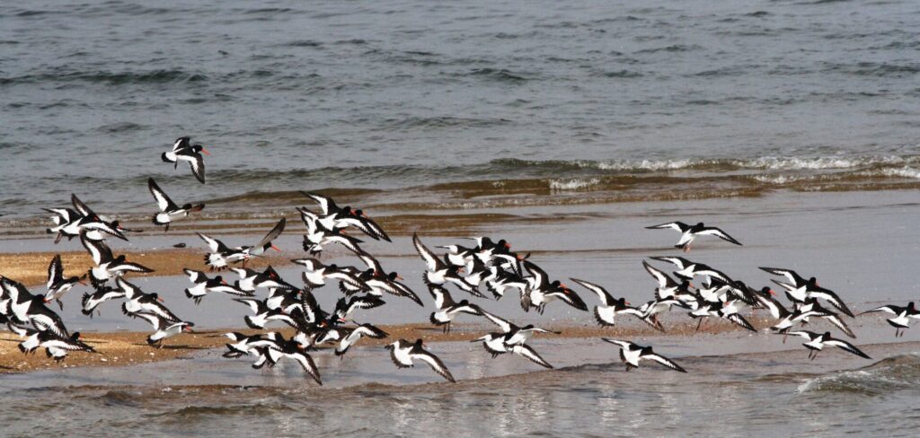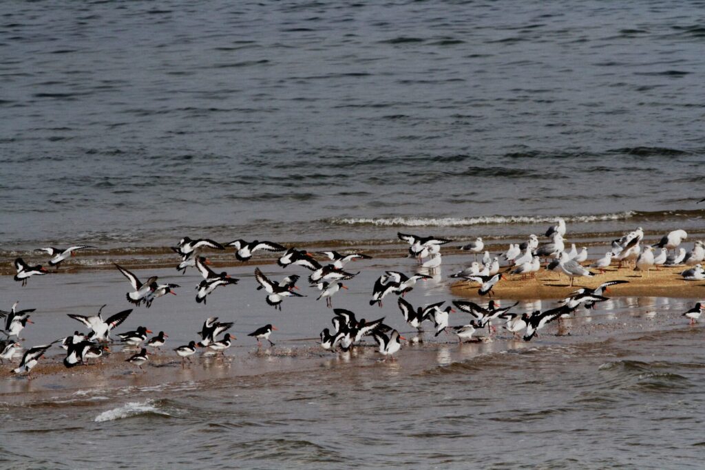 『ミヤコドリの群れと海岸線の鳥』