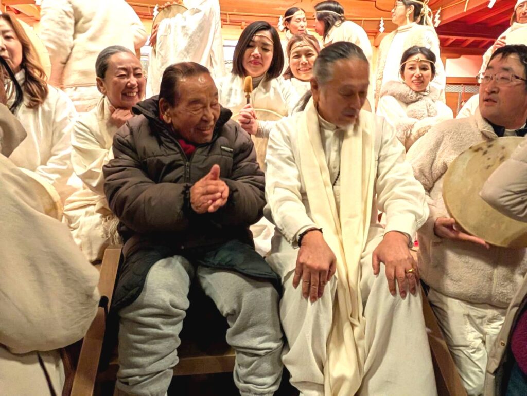 ドラム隊一人一人が、祈りを込めて作成し、ドラムを叩き、それぞれ違うドラムの音色の響きと祈る事で癒されていきます。2月3日の朝にメディスンドラム隊は節分祭で熊野修験の皆さまと採燈護摩、結界の中で一心に般若心境とご真言を唱えながらドラムを叩き、夜に今年で22年目の岡野弘幹氏(音楽家)の年明け音霊奉納があり、その笛の音色は澄んで天界からの音霊の様に心(魂)に響きました。その後、再びドラム隊の演奏がありました。