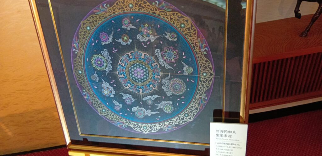 福田さんは星彩天描曼荼羅を描くアーティストです。会場に飾られた点描画をご覧になられた星野先達が最初に「羽黒三山を持ってきたね」とおっしゃいました。